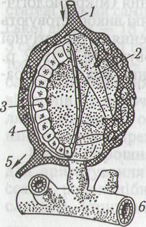 Молоко синтезується в альвеолах, частково — в дрібних і середніх вивідних протоках. З них воно надходить у крупні вивідні протоки, після чого накопичується в молочній цистерні, а з неї через сосковий канал виділяється у зовнішнє середовище. Молочна залоза функціонує в лактаційний період, який у корови триває в середньому 300 днів. Рис. 4.1. Схема будови молочної альвеоли та її кровообігу (за С. Поттоном): 1 — артеріола;. 2 — міоепітеліальна клітина; 3 — лактуюча клітина; 4 — капіляр; 5 — венула; 6 — вивідна протока