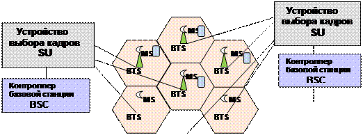 где: MS – мобильная станция BTS - базовая трансиверная (приемо-передающая) станция MSC – центр мобильной коммутации BSC – контроллер базовых трансиверных станций CClNU – центральное внутрисетевое устройство SS-M – подсистема мобильной связи SS-T – подсистема коммутации соединительных линий SS-7 – подсистема коммутации ОКС№7 (общеканальной сигнализации) SS-A – подсистема коммутации услуг: VMS – системы речевой почты, FMS – системы факсимильной связи lS - подсистема для внутренней связи VLR – регистр визитеров (гостей) в системе сотовой связи (ССС) HLR – регистр домашней сети EIR – регистр опознавания оборудования OMS – центр оперативно эксплуатации CS – подсистема управления ТфОП – телефонная сеть общего пользования СПД – сеть передачи данных ВОЛС – волоконно-оптическая линия связи