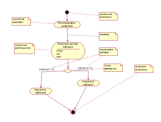 Простые последовательные переходы встречаются наиболее часто, но их одних недостаточно для моделирования любого потока управления. Как и в блок-схеме, можно включить в модель ветвление, которое описывает различные пути выполнения в зависимости от значения некоторого булевского выражения. Как видно из рис. 4, точка ветвления представляется ромбом. В точку ветвления может входить ровно один переход, а выходить - два или более. Для каждого исходящего перехода задается булевское выражение, которое вычисляется только один раз при входе в точку ветвления. Ни для каких двух исходящих переходов эти сторожевые условия не должны одновременно принимать значение "истина", иначе поток управления окажется неоднозначным. Но эти условия должны покрывать все возможные варианты, иначе поток остановится. (Ветвление семантически эквивалентно множественным переходам со сторожевыми условиями).