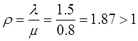 Приклад 5. Розглянемо систему контролю продукції, у якій контрольний прилад буде перевіряти всю продукцію. Якщо продукція надходить, коли контрольний прилад зайнятий, вона очікує, поки він звільниться. l = 1.5, m = 0.8. Проведемо розрахунки щодо інтенсивності навантаження та середньої довжини черги модернізованої системи контролю, коли пропускна спроможність контрольного приладу збільшується вдвічи. Розв’язання. Інтенсивність навантаження за формулою (1.22) становить: