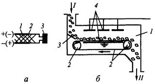Рисунок 4.3.5 – Сушка токами высокой частоты: а – к принципу работы: 1 – зона высушиваемого ТМ, 2 – обкладки (пластины) конденсатора, 3 – генератор высокой частоты; б – схема сушилки: 1 – сушильная камера, 2 – лента конвейера и вращающиеся барабаны, 3 – направляющая плоскость, 4 – пластины конденсатора; I – исходный ТМ, II – высушенный ТМ