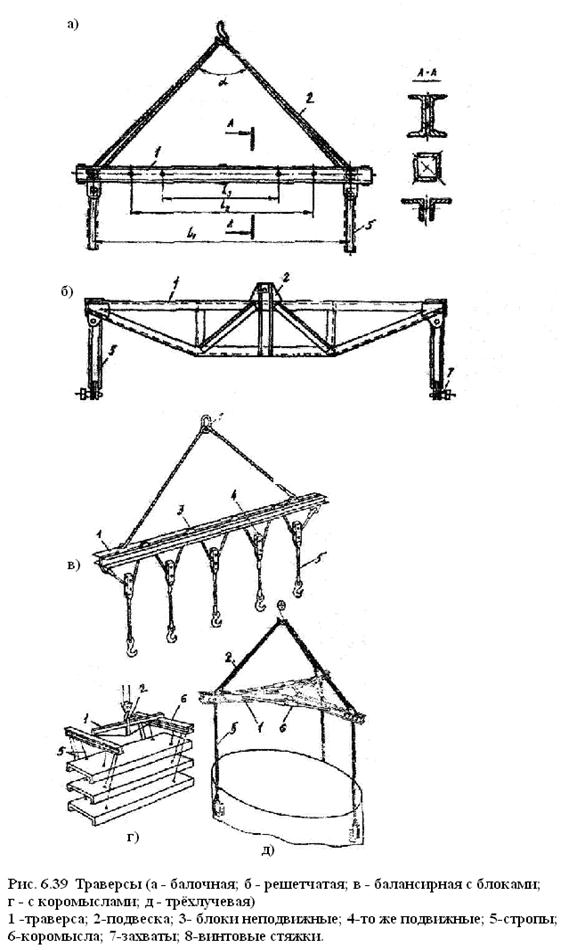 Применение наклонных стропов для подъема длинномерных и имеющих сложную пространственную конфигурацию грузов, а также КТО ведет к потере полезной высоты подъема ГПМ, возникновению значительных растягивающих усилий в стропах, сжимающих усилий в элементах поднимаемого груза и изгибающих моментов в монтажных петлях. Кроме того, практические схемы строповки отличаются от схем нагружения конструкции (оборудования) в процессе эксплуатации, поэтому последние часто не выдерживают приложения монтажных нагрузок, на восприятие которых они не рассчитаны. В таких случаях широко применяют траверсы, оснащенные инвентарными ГУ. Траверса — грузоподъемное приспособление в виде горизонтальной балки, работающей на сжатие {растяжение) или изгиб. По назначению траверсы разделяют на грузоподъемные и балансирные (уравновешивающие). По конструкции грузоподъемные траверсы подразделяют на балочные (рис.6.39, а), изготовляемые из труб или сваренные из швеллеров (уголков), и решетчатые —в виде развитых пространственных ферм (рис.6.39, б). Из-за ограничения собственной массы длина балочной траверсы не превышает 4 м. Для крепления ГУ в балке траверсы сверлят отверстия пли вваривают проушины, размещаемые попарно для строповки различных грузов длиной Li...L3. Решетчатая траверса состоит из фермы 1, подвески 2 для крепления к ГПМ, инвентарных ГУ 5 с полуавтоматическими захватами 7. Помимо обычных стропов траверсы комплектуют специализированными ГУ. Так строповочный канат может огибать блоки, расположенные на траверсе. Такие траверсы применяют для строповки грузов, у которых точки захвата расположены в разных уровнях (рис.6,39, в). Также применяют балочные траверсы с коромыслами для одновременной строповки нескольких пространственных элементов конструкций (рис.6,39, г), унифицированные траверсы для подъема различных строительных конструкций и др. При производстве СМР широко применяют специальные траверсы, например для подъема цилиндрических царг (элементов без днища), профилированного настила, подкрановых балок и пр. Траверса для подъема цилиндрических царг состоит из трехлучевой (в плане) балки /, по концам лучей которой выполнены отверстия для крепления проушин стропов 5 для подвески к ГПМ (рис,6,39, д). Винтовые стяжки 5 служат для регулировки угла между лучами, а инвентарные ГУ крепят за монтажные петли на парге.