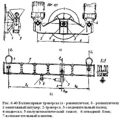 При совместной работе двух (нескольких) ГПМ или такелажных средств с различными параметрами (грузоподъемность, скорость подъема груза и пр.) применяют балансирные траверсы, уравновешивающие нагрузки на отдельные ГПМ при креплении перемещаемого груза к траверсе в одной точке. По конструкции такие траверсы разделяют на равноплечие (рис.6,40,а)—для ГПМ одной грузоподъемности и разноплечие — для различных ГПМ (рис,6,40,в). Разноплечая траверса позволяет полностью использовать грузоподъемность каждой ГПМ, при этом узел 5 крепления аппарата к траверсе должен быть смещен относительно ее центра, т.е. 121h=QAQb где hi 13 — длина плеч траверсы, м; Ql и Q2 — минимальная и максимальная грузоподъемности подъемных машин, К числу оригинальных конструкций балансирных траверс для монтажа вертикальных аппаратов спаренными кранами следует отнести траверсу с «перетекающим» стропом (рис.6.41) Траверса состоит из двухпетлевого канатного стропа, навешиваемого на крюки кранов, и четырех канатных блоков, закрепляемых на корпусе аппарата: два — по диаметральной плоскости и два — в плоскости, перпендикулярной ей. При неравномерной работе кранов, строп перемещается по блокам, исключая перегрузку.
