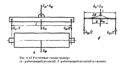 Если траверсу подвешивают к крюку 1 ИМ посредством наклонных тяг то на участке а между тягами кроме напряжений изгиба возникают дополнительные напряжения от действия сжимающей силы, величина которой зависит от угла между тягами В. Усилие в тяге. Н Пример. Рассчитать поперечное сечение и подобрать сортовой прокат. траверсы длиной 4 м для подъема аппарата массой m=67 x спаренными кранами грузоподъемностью Q = 25 % и Q5=63 т без поворота стрел с поднятым грузом (рис.6.42б). Решение. С учетом неравномерности нагружения кранов (Кв = 1.1), возможной перегрузни (/Сп = 1,05) а динамического характера приложения нагрузки (/Ся=1,1) определяем поперечную силу, действующюу на траверсу. Grp = mgKHKпKд = 67*10A*9,8*l,l *1,1* 1,1 =865 кН. 2. Определяем соотношение плеч траверсы 3. Определяем максимальный изгибающий момент, действующий в поперечном сечении траверсы в месте крепления поднимаемого аппарата (без учёта собственного веса траверсы)