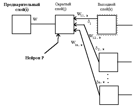 Рассмотрим один нейрон в скрытом слое, предшествующем выходному слою. При проходе вперед этот нейрон передает входной сигнал нейронам в выходном слое через соединяющие их веса. Во время обучения эти веса функционируют в обратном порядке, пропуская величину ошибки от выходного слоя назад к скрытому слою. Каждый из этих весов умножается на величину δqk нейрона, к которому он присоединен в выходном слое. Величина δpj, необходимая для нейрона скрытого слоя, получается суммированием всех таких произведений и умножением на производную сжимающей функции (см. рис. 16):