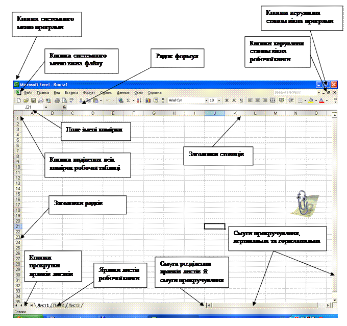 Після завантаження ЕхсеІ на екрані з'являється основне вікно табличного процесора (рис.3). У верхній частині цього вікна розміщуються рядок заголовка, головне меню, стандартна панель інструментів, панель інструментів форматування; в нижній частині - рядок стану і горизонтальна смуга прокручування; у правій частині -вертикальна смуга прокручування; по центру - робоча область екрана, що містить рядок формул. Вікно ЕхсеІ містить багато стандартних елементів включаючи: • рядок заголовку, в якому відтворюється ім'я програми та поточного файлу, знаходяться кнопка системного меню та кнопки керування станом вікна; керування станом вікна;.