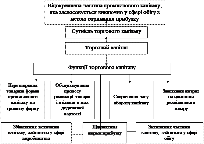 Торговий капітал — відокремлена частина промислового капіталу, що застосовується виключно у сфері обігу окремою групою підприємців, які займаються реалізацією товарів і перетворенням товарного капіталу на грошовий з метою отримання прибутну. Об'єктивну можливість відокремлення і перетворення товарного капіталу на торговий створюють зміст кругообороту промислового капіталу та система капіталістичних виробничих відносин, основою яких є додаткова вартість і способи її збільшення, що виявляється у таких аспектах: - виробництво та обіг товарів є різними сферами кругообороту промислового капіталу; - виробництво товарів і втіленої в них додаткової вартості не притаманне сфері обігу: у ній додаткова вартість лише реалізується і розподіляється; - товарна форма промислового капіталу ніколи не покидає сфери обігу. В ній відбувається перетворення товарного капіталу на грошовий, а працівники цієї сфери спеціалізуються на операціях купівлі-продажу товарів і безпосереднього відношення до їх виробництва не мають; - особливим чинником відокремлення товарної форми промислового капіталу та перетворення її на торговий є конкуренція. Вона, з одного боку, спонукає підприємців зменшувати витрати, розширювати обсяги виробництва, активізувати реалізацію товарів, а з іншого - породжує труднощі збуту продукції (необхідність пошуку нових ринків, вивчення попиту, оволодіння технологією торгівлі тощо). Відокремлення товарної форми промислового капіталу, перетворення її на торговий капітал, утворення особливої групи підприємців, що спеціалізуються лише на реалізації товарів, значно зменшують труднощі реалізації і тому прискорюють оборот капіталу, о це сприяє підвищенню продуктивності промислового, а отже і всього суспільного капіталу, слугує збільшенню маси додаткової вартості, зростанню норми прибутку. Наслідком відокремлення торгового капіталу є подальший розвиток суспільного поділу праці, спеціалізація виробництва та обігу, їх концентрація, розширення ринку для промислового капіталу, зниження витрат капіталу на одиницю продукції та підвищення норми прибутку. Утворення відокремлених від промислового капіталу торгових підприємств, які забезпечують акт Т"—Г" у процесі кругообороту промислового капіталу, сприяв скороченню часу обороту капіталу, зменшенню частки суспільного капіталу, що обслуговує реалізацію товарів. Адже торговий підприємець може обслуговувати реалізацію товарів багатьох промисловців галузі, а іноді різних галузей виробництва. Упродовж одного обороту промислового капіталу торговий капітал може здійснити кілька оборотів, оскільки час обороту торгового капіталу не тотожний часу обороту промислового: він залежить від обсягів товарної продукції галузі або кількох галузей виробництва. Це зменшує потребу сфери обігу у грошовому капіталі в масштабах усього суспільства. Торговий капітал концентрує попит на товари і тому має змогу впливати на виробництво, пристосовуючи його до потреб ринку, стимулюючи випуск товарів широкого асортименту, що мають попит, у тому числі інноваційних виробів, скорочує або навіть припиняє виробництво менш прибуткових товарів. Він впливає також на попит, пов'язує виробництво не лише з віддаленими ринками в країні, а й за її межами. Узагальнюючи роль торгового капіталу, К. Мар