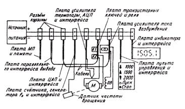 Схема микропроцессорного устройства может быть смонтирована на одной или нескольких платах. В тех случаях, когда стремятся создать универсальный микропроцессорный контроллер, разрабатываются отдельно плата с микропроцессором и памятью, отдельно платы со слаботочными преобразователями – ЦАП, АЦП, счетчиками и т. д. и интерфейсами. Каждая из этих плат имеет разъем, через который подводятся и выводятся данные и сигналы управления. Кроме того, создается конструкция, состоящая из ряда ответных частей разъемов плат, установленных на основание и называемая корзиной. Разъемы в корзине соединяют так, чтобы обеспечить правильный обмен данными и сигналами управления между микропроцессором и интерфейсными платами. Кроме того, здесь монтируют источники питания, а провода от них разводят по разъемам корзины, обеспечивая электропитание всех плат. Силовые элементы электросхем (ключи, усилители мощности, реле, тиристоры) также монтируют на отдельных платах и стремятся, по возможности, поместить их в ту же корзину. Связь силовых плат с их интерфейсами приходится обеспечивать обычно не через корзину, а внешними соединениями. Через разъемы корзины подводится только электропитание силовых плат. Для рассмотренного выше МПУ управления двигателем на рис. 10.4. показана схема реализации в виде многоплатного контроллера.