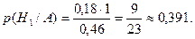 Пример. После двух выстрелов двух стрелков, вероятности попаданий которых равны 0,6 и 0,7, в мишени оказалась одна пробоина. Найти вероятность того, что попал первый стрелок. Решение. Пусть событие А – одно попадание при двух выстрелах, а гипотезы: Н 1 – первый попал, а второй промахнулся, Н 2 – первый промахнулся, а второй попал, Н 3 – оба попали, Н 4 – оба промахнулись. Вероятности гипотез: р(Н 1) = 0,6·0,3 = 0,18, р (Н 2) = 0,4·0,7 = 0,28, р (Н 3) = 0,6·0,7 = 0,42, р (Н 4) = 0,4·0,3 = 0,12. Тогда р (А/Н 1) = р (А/Н 2) = 1, р (А/Н 3) = р (А/Н 4) = 0. Следовательно, полная вероятность р (А) = 0,18·1 + 0,28·1 + 0,42·0 + 0,12·0 = 0,46. Применяя формулу Байеса, получим: