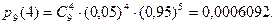 Пример. Для получения приза нужно собрать 5 изделий с особым знаком на этикетке. Найти вероятность того, что придется купить 10 изделий, если этикетки с этим знаком имеют 5% изделий. Решение. Из постановки задачи следует, что последнее купленное изделие имеет особый знак. Следовательно, из предыдущих девяти эти знаки имели 4 изделия. Найдем вероят-ность этого по формуле Бернулли: р = 0,0006092·0,05 = 0,0000304.