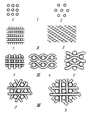 Схемы армирования композиционных материалов: I - однонаправленная; II - двухнаправленная; III - трехнаправленная; IV - четырехнаправленная. Укладка волокон (1 - прямоугольная, 2 - гексагональная, 3 - косоугольная, 4 - с искривленными волокнами, 5 - система из n нитей)