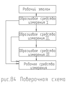 Правовую основу ГСИ в нашей стране определяет закон РФ «Об обеспечении единства измерений». Он устанавливает: -основные понятия; -организационную структуру государственного управления обеспечения единства измерений; -нормативные документы по обеспечению единства измерений; -единицы величин и государственные эталоны; -средства и методы измерений. Закон регламентирует лицензирование метрологической деятельности, российскую систему калибровки (для деятельности неконтролируемой государством), добровольную систему сертификации средств измерений. Технической основой ГСИ является: 1) система государственных эталонов единиц и шкал физических величин; 2) система передачи размеров единиц и шкал физических величин от эталонов к другим средствам измерения (поверочная схема); 3) система разработки, постановки на производство и выпуска в эксплуатацию рабочих средств измерения; 4) система обязательных государственных испытаний средств измерений, предназначенных для серийного производства и ввоза из-за границы; 5) система государственной и ведомственной метрологической аттестации и поверки средств измерения; 6) система стандартных образцов и свойств веществ. Система Госстандарта включает в себя большое количество различных учреждений: научно-исследовательские институты (НИИ), научно-производственные объединения, ведомственные объединения, региональные объединения (Поволжское отделение Госстандарта), хранилища эталонов. Под эталонами понимается некоторое материальное воплощение единиц измерения, существуют эталоны всех основных единиц измерения. Эталоны служат для воспроизведения, хранения и передачи размеров единиц физических величин с наивысшей для данного класса метрологической точностью. По уровню признания различают международные и государственные эталоны. Наивысшей точностью в рамках государства обладают первичные эталоны. Путем сличения с ними изготавливают вторичные эталоны, копии этих эталонов (рабочие) используются в практической метрологии для передачи точности единиц физических величин образцовым средствам измерения. Частным случаем этих средств являются меры, предназначенные для хранения и (или) воспроизведения единицы физической величины или какого-либо иного ее размера. Образцовые меры по точности различаются на разряды. Наивысшей точностью обладает 1-ый разряд, при увеличении разряда на единицу точность средств измерения снижается в 2-4 раза. Образцовые средства измерения иногда используют в особо точных научных исследованиях, а обычно они используются для передачи точности рабочим средствам измерения. Последние используются непосредственно для измерений и не могут служить для передачи точности другим средствам. Приведем пример поверочной схемы, которая регламентируется этим законом (рис. 84).
