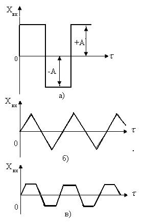 Затем подают колебания с частотой ω2, ω3 и так далее и определяют Но таким образом в реальных условиях эксперимент не проводят, так как для подачи гармонических колебаний на вход объекта необходимо иметь генератор синусоидальных колебаний, частоту которых можно менять. Поэтому на практике на вход объекта подают периодические колебания прямоугольной волны (рис. 5.24, а), треугольной волны (рис. 5.24, б) или трапецеидальной волны (рис. 5.24, в).