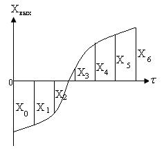 Почему это возможно? Потому что и входные и выходные колебания представляют собой сумму гармоник при к, стремящимся к бесконечности. При этом амплитуды последующих гармоник быстро уменьшаются, а частота возрастает. Так как реальные объекты управления плохо пропускают колебания с большой частотой, т.е. являются фильтрами при больших частотах, можно на выходе и на входе использовать только первые гармоники и использовать их для определения частотных характеристик. Амплитуда первой гармоники входных колебаний определяется по формуле: Авх=1,27а, где а – отклонение входной координаты от среднего значения. Для разложения выходных колебаний в ряд Фурье пользуются методом шести, двенадцати или двадцати четырех ординат. Для этого отрезок кривой, равный по времени одному периоду (рис 5.26), разбивают в зависимости от выбранного метода на n -интервалов (например, шесть) и определяют ординаты х0, х1, х2, х3, х4, х5, х6.