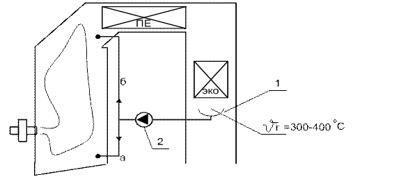 a) рециркуляция вниз топки; б) рециркуляция вверх топки. 1. заборное устройство; 2. дымосос рециркуляции газов (ДРГ). Рециркуляция вниз топки (а). Продукты сгорания с температурой 300-400°С, отбираемые за водяным экономайзером, подаются в нижнюю часть топки через шлицы (щели) или через горелки, что приводит к снижению температуры факела. В результате снижается интенсивность радиационного теплообмена и паропроизводительности котла (D). Для поддержания D=const, необходимо увеличить расход топлива, что приведет к: 1. повышению температуры газов на выходе из топки; 2. увеличению объема продуктов сгорания за топкой. В результате повысится коэффициент теплопередачи (К), температурный напор ( Рециркуляция вверх топки (б) п рактически не сказывается на топочном режиме, но может использоваться для снижения шлакования поверхностей нагрева за топкой. (для регулирования не используется). Кроме изменения