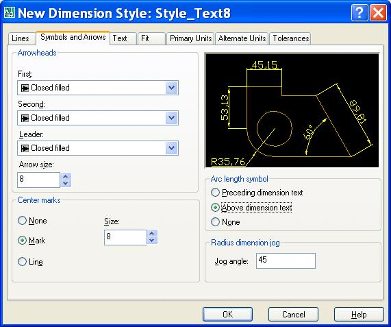 При задании типа стрелки в первом (First) раскрывающемся списке точно такой же тип автоматически устанавливается и во втором (Second) раскрывающемся списке. Если же требуются разнотипные стрелки, то после установки одного типа в первом списке нужно задать стрелки другого типа во втором списке. Обратите внимание на то, что по принятой терминологии "стрелками" называют окончания любого типа, в том числе засечки и точки. Область Center Marks (Маркеры центра) определяет тип и размер маркера центра окружностей и дуг. Маркеры вычерчиваются путем щелчка на кнопке Center Mark панели инструментов Dimension. Можно набрать команду Dimcenter. Для создания маркера-крестика следует установить переключатель Mark, а для создания маркера в виде осевых линий - переключатель Line. Маркер-крестик обычно используют для обозначения на чертежах центров дуг, а взаимно-перпендикулярными осевыми линиями отмечают центры окружностей. В этой области два параметра: