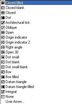 Изменить внешний вид стрелок на концах размерной линии и выноски Leader можно в группе символов Arrowheads (Стрелки). Размер стрелки задают в поле Arrowsize. Размеры стрелок надо задавать такими, какими они должны быть распечатаны на бумаге. Помимо обычных стрелок на концах размерных линий можно установить засечки, точки и другие символы из раскрывающегося списка (рис. 5.9).