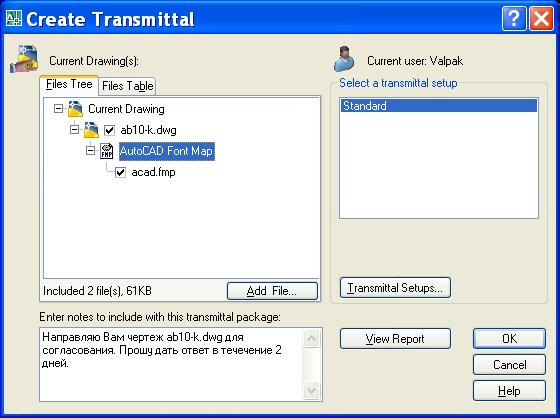 Перед отправкой по электронной почте удобно собрать все файлы, относящиеся к данному чертежу, в один пакет. Этот набор можно отправлять затем своим коллегам, заказчикам и пр. При открытом чертеже выполните команду File - eTransmit. В диалоговом окне Create Transmittal (Создание набора для передачи) можно сформировать файл, а затем передать его как вложение электронного сообщения. В файле передачи будет находиться основной чертеж и все связанные с ним файлы (рис. 9.12).