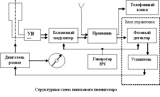Пеленгация производится равносигнальным методом. Равносигнальное направление образуется путем периодического изменения (с частотой несколько десятков герц) фазы напряжения рамки, в результате чего с такой же частотой изменяется на 180º направление минимума кардиоиды. Сигнал рамочной антенны усиливается в УВЧ примерно до уровня сигнала ненаправленной антенны и с помощью фазирующего контура поворачивается по фазе на 90º. Затем сигнал поступает на балансный модулятор, управляемый генератором низкой частоты. Действие балансного модулятора эквивалентно механическому переключению с заданной частотой выводов рамки для изменения фазы ее сигналов на 180º. Суммирование сигналов рамочной и ненаправленной антенн осуществляется во входном контуре приемника.После усиления и детектирования выделяется огибающая сигнала, которая поступает в телефонный канал для прослушивания работы пеленгуемой радиостанции. Кроме того, формируется огибающая сигнала на частоте переключений фазы напряжения рамки, поступающая в блок управления компасного канала для автоматического управления вращением рамки (е) и называемая сигналом ошибки. Его фаза зависит от направления на пеленгуемую радиостанцию. Сигнал ошибки сравнивается в фазовом детекторе с опорным сигналом, приходящим отгенератора низкой частоты и имеющим неизменную начальную форму. На выходе фазового детектора вырабатывается сигнал управления в виде постоянного тока, знак которого зависит от направления на пеленгуемый источник радиоизлучений (ж). После усиления сигналы управления поступают на двигатель,который поворачивая рамку, совмещает равносигнальное направление с направлением на пеленгуемую радиостанцию. Угол поворота указывается на стрелочном приборе. Рассмотренная система обеспечивает однозначность отсчета пеленга, так как обладает лишь одним устойчивым положением равновесия, соответствующим истинному пеленгу.