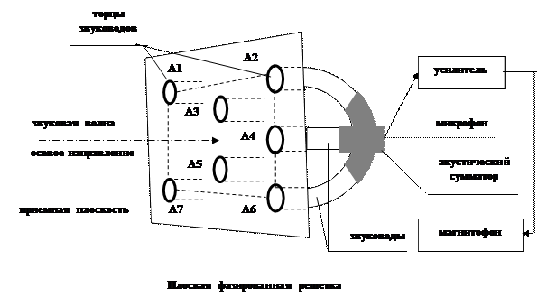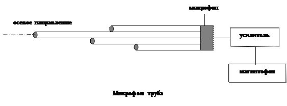 В этих точках (А1, А2 и т.д.) размещаются либо микрофоны, выходные сигналы которых суммируются электрически, либо, и чаще всего, открытые торцы звуководов, например трубки достаточно малого диаметра, которые обеспечивают синфазное сложение звуковых полей от источника в некотором акустическом сумматоре. К выходу сумматора подключен микрофон. Если звук приходит с осевого направления, то все сигналы, распространяющиеся по звуководам, будут в фазе, и сложение в акустическом сумматоре даст максимальный результат. Если направление на источник звука не осевое, а под некоторым углом к оси, то сигналы от разных точек приемной плоскости будут разными по фазе и результат их сложения будет меньшим. Чем больше угол прихода звука, тем сильнее его ослабление. Число приемных точек в таких решетках составляет несколько десятков. Конструктивно плоские фазированные решетки встраиваются либо в переднюю стенку атташе-кейса, либо в майку-жилет, которая надевается под рубашку и т.п. Необходимые электронные блоки могут располагаться также в кейсе, либо под одеждой. Таким образом, плоские фазированные решетки с камуфляжем визуально более конспиративны по сравнению с параболическим микрофоном. Микрофон – труба представляет собой трубчатую фазированную приемную акустическую антенну нагруженную на высокочувствительный микрофон или решетку микрофонов, включенных последовательно. В отличие от параболических микрофонов и плоских акустических решеток принимает звук не на плоскости, а вдоль некоторой линии, совпадающей с направлением на источник звука. Характерным представителем такого типа микрофонов является микрофон «Акустическое ружье».