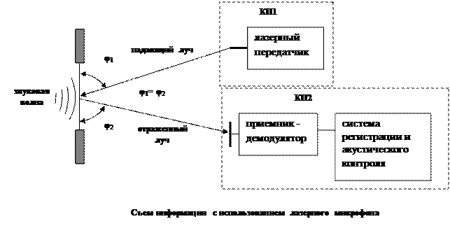 В качестве источника излучений может применяться, например, гелий-неоновый лазер. Наводка лазерного излучения на оконное стекло нужного помещения осуществляется с помощью телескопического визира. На сегодняшний день уже появились принципиальные возможности регистрации колебаний стекла на расстоянии до 10ˉ¹ - 10ˉ¹ м. Дальность ведения разведки составляет до 1000м. В точке расположенной по нормали к оконному остекленению достаточно организация одного контрольного поста (КП). В противном случае необходимо организовывать два КП, место второго выбирается с учетом закона отражения светового луча φ1= φ2.