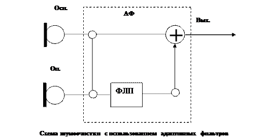 Если прослушать записанную на улице магнитофонную запись, то основное, что мы услышим, это гул, в котором сольются множество непонятных звуков, попавших из акустического поля в микрофон. Кроме того, на электронную аппаратуру записи, передачи и воспроизведения речевого сигнала действуют разнообразные электрические и электромагнитные помехи, которые мы тоже слышим в наушниках. Способы очистки речевых сигналов от пространственной помехи, источник которой расположен в стороне, заложены в конструкциях направленных микрофонов. Однако существуют акустические помехи расположенные на одной оси с источником речевого сигнала, либо помехи достаточно значительные, чтобы оказывать мешающее действие даже при использовании направленных микрофонов. Для повышения качества и обеспечения возможности коррекции записанного разговора используются стереомагнитофоны и эквалайзеры. Стереомагнитофоны позволяют за счет стереоэффекта дифференцировать и отделять от информативной разговорной речи такие помехи, как шумы бытовых приборов, внешние уличные шумы и т.д. Эквалайзеры представляют собой устройства с набором различных фильтров: фильтров верхних и нижних частот, полосовых, октавных, чебышевских и других. Эти фильтры включаются по определенной программе в зависимости от характера искажений сигнала и помех. Наряду с эквалайзерами для повышения разборчивости речи используются специальные программно-аппаратные комплексы. В качестве примера шумовой очистки речевого сигнала рассмотрим использование адаптивного фильтра (АФ). По способу, различения помехи от сигнала, АФ подразделяются на одноканальные (АФ1) и двухканальные (АФ2). Одноканальный фильтр имеет только основной вход, а двухканальный дополнительно опорный вход.