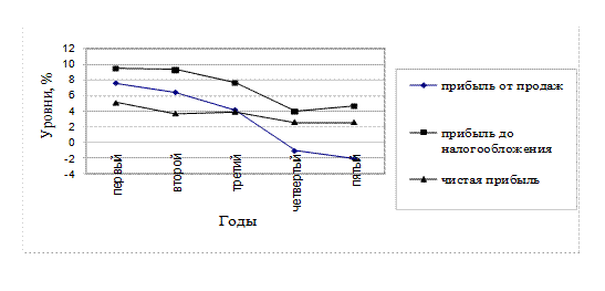 Кривая, характеризующая динамику прибыли от продаж, начиная со второго года, пошла вниз. Меньше по сравнению с кривой, отражающей динамику чистой прибыли, колебания прибыли до налогообложения.