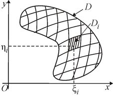 Пусть некоторая функция двух переменных непрерывная и ограниченная в некоторой области D плоскости Оxy. Пусть область D ограничена конечным числом непрерывных линий, уравнения которых имеют вид или . С помощью таких же произвольно выбранных непрерывных линий разобьем область D на n элементарных областей , , площади которых равны , (рис. 75).