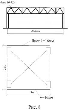 Рациональной системой для пролетов 40-60м является объемно-блочная предварительно напряженная конструкция, в которой несущая конструкция совмещена с ограждающей (рис.8). Конструкция состоит из объемных блоков, включающих две вертикальные фермы высотой 2,5м, расставленные на расстоянии 3м и соединенные по верхним и нижним поясам стальными листами δ=16мм. Балка собирается из отдельных блоков длиной 10-12м.