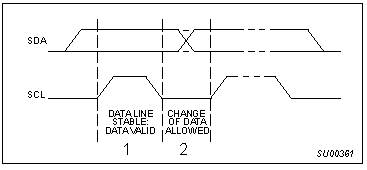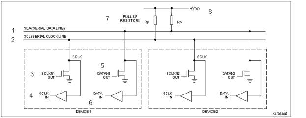 ------------------------ Как SDA, так и SCL являются двунаправленными линиями, подсоединенными к положительному источнику питания через подтягивающий резистор (см. Рис 4). Когда шина свободна, обе линии находятся в ВЫСОКОМ положении. Выходные каскады устройств, подключенных к шине, должны иметь открытый сток или открытый коллектор для обеспечения функции монтажного И. Данные по шине I2C могут передаваться со скоростью до 100 кбит/с в стандартном режиме, и до 400 кбит/с в “быстром” режиме. Количество устройств, подключенных к шине, определяется единственным параметром - емкостью линии (до 400 пф).