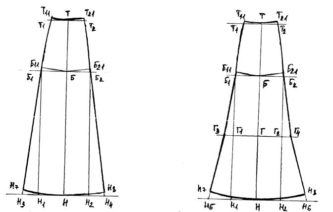 Линию швов проводят плавно через точки Т1, Б1, Г3, Н5 и Т2, Б2, Г4, Н6. Затем уравнивают боковые срезы юбки по длине клина посередине Б 11 Н 7 =Б 21 Н 8 =БН