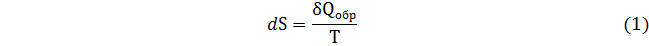 Для того, чтобы первый закон термодинамики выразить в дифференциальной форме необходимо было ввести понятие о физических величинах как функциях состояния и величинах, которые являются функциями процесса. Подобная ситуация имеет место и для второго закона термодинамики. В этом случае его математическое выражение зависит от типа процесса. С позиций второго закона термодинамики все процессы разделяются на два класса, которые принято называть термодинамически обратимыми и термодинамически необратимыми. Термодинамически необратимые процессы – это процессы, которые проходят обычным, естественным образом под действием тех или иных движущих сил. Например, подвод тепла к какому-то веществу вызывает процесс изменения внутренней энергии, который обнаруживается по повышению температуры. Замечательным примером термодинамически необратимого процесса являются химические реакции, когда после смешения некоторых веществ наблюдается самопроизвольный процесс образования продуктов.* Термодинамически обратимый процесс более сложное понятие и мы пока ограничимся его констатацией. Для термодинамически обратимого процесса второй закон термодинамики выражается уравнением (1)