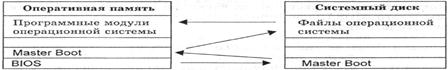 Анализ и исполнение команд пользователя, включая загрузку готовых программ из файлов в оперативную память и их запуск, осуществляет командный процессор операционной системы. Для управления внешними устройствами компьютера используются специальные системные программы — драйверы. Драйверы стандартных устройств образуют в совокупности базовую систему ввода-вывода (BIOS), которая обычно заносится в постоянное ЗУ компьютера. 43. ПРОЦЕСС ЗАГРУЗКИ ОС В ПАМЯТЬ КОМПЬЮТЕРА Файлы операционной системы хранятся во внешней, долговременной памяти (на жестком, гибком или лазерном диске). Однако программы могут выполняться, только если они находятся в оперативной памяти, поэтому файлы операционной системы необходимо загрузить в оперативную память. Диск (жесткий, гибкий или лазерный), на котором находятся файлы операционной системы и с которого производится ее загрузка, называется системным. После включения компьютера производится загрузка операционной системы с системного диска в оперативную память. Загрузка должна выполняться в соответствии с программой загрузки. Однако для того чтобы компьютер выполнял какую-нибудь программу, эта программа должна уже находиться в оперативной памяти. Разрешение этого противоречия состоит в последовательной, поэтапной загрузке операционной системы. Самотестирование компьютера. В состав компьютера входит энергонезависимое постоянное запоминающее устройство (ПЗУ), содержащее программы тестирования компьютера и первого этапа загрузки операционной системы - это BIOS (Basic Input/Output System - базовая система ввода/вывода). После включения питания компьютера или нажатия кнопки Reset на системном блоке компьютера или одновременного нажатия комбинации клавиш {Ctrl+Alt+Del} на клавиатуре процессор начинает выполнение программы самотестирования компьютера POST (Power-ON Self Test). Производится тестирование работоспособности процессора, памяти и других аппаратных средств компьютера. В процессе тестирования сначала могут выдаваться диагностические сообщения в виде различных последовательностей коротких и длинных звуковых сигналов (например, 1 длинный и 3 коротких - не подключен монитор, 5 коротких - ошибка процессора и так далее). После успешной инициализации видеокарты краткие диагностические сообщения выводятся на экран монитора. Для установки правильной даты и времени, а также внесения изменений в конфигурацию аппаратных средств компьютера в процессе выполнения самотестирования необходимо нажать клавишу {Del}. Загрузится системная утилита BIOS Setup, имеющая интерфейс в виде системы иерархических меню. Пользователь может установить новые параметры конфигурации компьютера и запомнить их в специальной микросхеме памяти, которая при выключенном компьютере питается от батарейки, установленной на системной плате. В случае выхода из строя батарейки конфигурационные параметры теряются и компьютер перестает нормально загружаться. Загрузка операционной системы. После проведения самотестирования специальная программа, содержащаяся в BIOS, начинает поиск загрузчика операционной системы. Происходит поочередное обращение к имеющимся в компьютере дискам (гибким, жестким, CD-ROM) и поиск на определенном месте (в первом, так называемом загрузочном секторе диска) наличия специальной программы Master Boot (программы-загрузчика операци