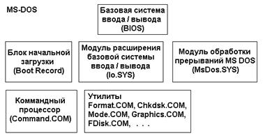 Каждый из указанных модулей выполняет определенную часть функций, возложенных на ОС. Места постоянного размещения этих модулей различны. Так, базовая система ввода/вывода находится в постоянном запоминающем устройстве (ПЗУ), а не на дисках, как все остальные модули. Базовая система ввода/вывода (BIOS) выполняет наиболее простые и универсальные услуги операционной системы, связанные с осуществлением ввода-вывода. В функции BIOS входит также автоматическое тестирование основных аппаратных компонентов (оперативной памяти и др.) при включении машины и вызов блока начальной загрузки DOS. Блок начальной загрузки (или просто загрузчик) — это очень короткая программа, единственная функция которой заключается в считывании с диска в оперативную память двух других частей DOS — модуля расширения базовой системы ввода/вывода и модуля обработки прерываний. Модуль расширения базовой системы ввода/вывода дает возможность использования дополнительных драйверов, обслуживающих новые внешние устройства, а также драйверов для нестандартного обслуживания внешних устройств. Модуль обработки прерываний реализует основные высокоуровневые услуги DOS, поэтому его и называют основным. Командный процессор DOS обрабатывает команды, вводимые пользователем. Утилиты DOS — это программы, поставляемые вместе с операционной системой в виде отдельных файлов. Они выполняют действия обслуживающего характера, например, разметку дискет, проверку дисков и т.д. 2 файла: · Загружаемые (внешние, устанавливаемые) драйверы - это программы, хранящиеся на диске и предназначенные для управления внешними устройствами, вторые отличаются от стандартных либо по своим техническим параметрам, либо особыми режимами эксплуатации- Загружаемые драйверы подключаются к системе только тогда, когда они указаны в файле конфигурации CONFIG.SYS. Возможность использования загружаемых драйверов облегчает адаптацию операционной системы к новым внешним устройствам. · командного файла AUTOEXEC.BAT. С помощью этого файла вы можете произвести настройку параметров операционной среды. Например, создать виртуальный диск, обеспечить смену режимов печати, загрузить вспомогательные программы и т.д.