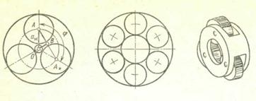 а) б) в) Рис. 20.35. Размещение сателлитов в водиле Условие симметричного размещения сателлитов. Чтобы установить сателлит между двумя центральными колесами (см. рис. 20.35, а), необходимо повернуть их одно относительно другого так, чтобы зубья сателлита оказались напротив впадин центральных колес. Лишь при этом условии возможна установка других сателлитов. Для передачи на рис. 20.34, а условие сборки имеет вид