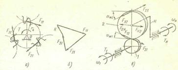 Рис. 20.36. Усилия в планетарной передаче Участие сателлита одновременно в двух зацеплениях приводит к тому, что одновенцовый сателлит не передает вращающего момента и находится в равновесии под действием сил F12 и F32 со стороны центральных колес, а также силы FH2 от водила H (рис. 20.36, б). Принимая, что углы зацеплений