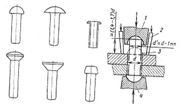Рис.30.1.Конструктивные Рис.30.2. Схема формирования замыкающей формы заклепок головки при клепке: 1-обжимка; 2-прижим; 3-формируемая головка; 4-поддержка.