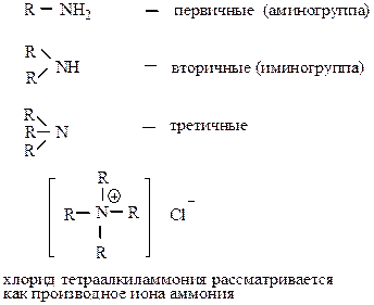 Можно рассматривать как производные аммиака в котором один или все атомы водорода замещены на углеводородный радикал.