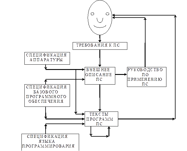 некоторых требований. Исходя из этих требований, разработчик создает внешнее описание ПС, используя при этом спецификацию (описание) заданной аппаратуры и, возможно, спецификацию базового программного обеспечения. На основании внешнего описания и спецификации языка программирования создаются тексты программ ПС на этом языке. По внешнему описанию ПС разрабатывается также и пользовательская документация. Текст каждой программы является исходной информацией при любом ее преобразовании, в частности, при исправлении в ней ошибки. Пользователь на основании документации выполняет ряд действий для применения ПС и осуществляет интерпретацию получаемых результатов. Везде здесь, а также в ряде других процессах разработки ПС, имеет место указанный перевод информации. На каждом из этих этапов перевод информации может быть осуществлен неправильно, например, из-за неправильного понимания исходного представления информации. Возникнув на одном из этапов разработки ПС, ошибка в представлении информации преобразуется в новые ошибки результатов, полученных на последующих этапах разработки, и, в конечном счете, окажется в ПС.
