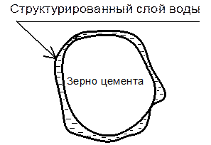 Частица цемента находится в воде затворения, которая начинает адсорбироваться на её поверхности. Стадия 2.