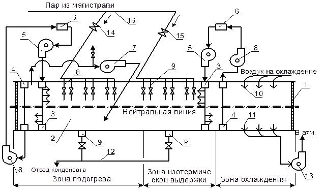 Изделия, поступающие на тепловую обработку в зону І, подогреваются «острым паром» (рис. 3). Пар к камере подаётся при помощи магистрального паропровода 16, который, пройдя через вентиль 14 и двусторонние стояки 8, поступает в зону подогрева. В этой зоне пар, смешиваясь с воздухом, образует ПВС. Первая пара стояков устанавливается на расстоянии 20 – 25 м от входа в камеру с шагом 2 – 6 м. Пар находящийся в ПВС отдает тепло изделиям и ограждающим конструкциям камеры и, превратившись в конденсат, через конденсатоотводчик 17 удаляется в конденсатопровод 12. Для более рационального использования энергии пара и поддержания стационарного режима ТО устраивают его рециркуляцию и организуют работу воздушных завес в начале зоны подогрева и в конце зоны изотермической выдержки. Принцип действия воздушных завес следующий. Холодный воздух у загрузочного торца камеры и на стыке зон ІІ и ІІІ при