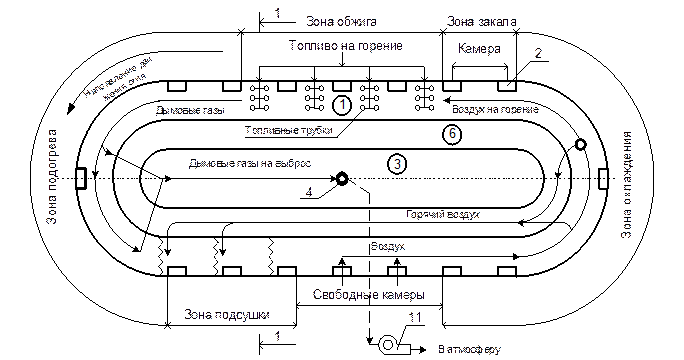 Рис.1. Схема кольцевой печи Основным элементом такой печи является замкнутый сквозной обжигательный канал 1, который не имеет внутри постоянных перегородок. В наружных стенах обжигательного канала имеются отверстия 2, называемые ходками. Через них производится загрузка сырца в печь и разгрузка обожженного кирпича. Часть пространства обжигательного канала между ходками называют камерой. Во внутренней стене печи расположен дымовой канал 3, который соединяется отверстием 4 с дымовой трубой или дымососом 10. Обжигательный и дымовой каналы связаны между собой при помощи отверстий 5, называемых дымовыми очелками. Очелки оборудованы дымовыми конусами 9 (клапанами) при помощи которых этот канал может подключаться к обжигательному или отключаться от него. Над дымовым каналом находится жаровой канал 6. Он предназначен для перемещения горячего воздуха, образующего при охлаждении обожжённого кирпича. Жаровой канал также соединён с обжигательным каналом при помощи жаровых очелков 7, снабжённых жаровыми конусами 8.