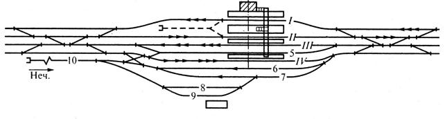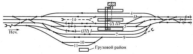 I и II главные пути предназначены в основном для пассажирского движения, но возможен по ним и пропуск грузовых поездов, дальних пассажирских и пригородных скорых. Расположение III-го главного пути двустороннего действия выбирают в целом для участков, в зависимости от условий развития головной пассажирской станции и удобства примыкания выходов с сортировочной станции. Путь 5, по первому варианту, служит для скрещения грузовых поездов, следующих по среднему главному, а по второму варианту, для обгона нечетных поездов. Путь 7 и 9 в обоих случаях служат для сборных поездов, а во втором варианте путь 7 служит также для скрещения грузовых поездов. Схема участковой станции на 4-х путном участке