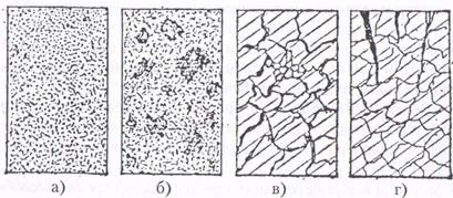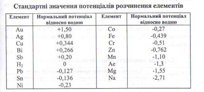Рис. 13.1. Види корозійного руйнування: а - суцільне; б - поверхневе; в - міжкристалічне; г - тріщини З точки зору фізичної природи процесу корозії електрохімічною корозією називають таку корозію, яка супроводжується появою електричного струму і наявністю рідини - електроліту. Електролітами можуть бути електропровідні рідини: луги, розчини кислот, солей, газів. При контакті металу та електроліту іони з поверхні металу переходять в електроліт, і спричиняють виникнення між ними електрорушійної сили (ЕРС). При розчиненні металу в електроліт переходять лише позитивно заряджені іони. Тому електроліт, що контактує з металічною пластинкою, заряджається позитивно, а сама пластинка - негативно за рахунок електронів, що залишилися на ній. Якщо порівняти метали за здатністю "переходити в розчин", то вона різна. Тому якщо пластинки різних металів опустити в один електроліт, то вони будуть мати різні потенціали, причому чим більше іонів металу перейде в розчин, тим більшим буде негативний потенціал цього металу. Значення потенціалів розчинення деяких елементів наведено в табл. 13.1 (вимірювання зроблено по водневому електроду, потенціал якого прийнятий рівним нулю). Таблиця 13.1