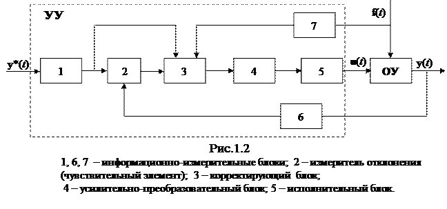 I. Управление по замкнутому циклу (по отклонению, по ошибке, с единичной отрицательной обратной связью) – связи 2) и 3) разомкнуты. II. Управление по разомкнутому ци клу – связи 1), 2) и 3) разомкнуты. III. Управление по разомкнутому циклу с компенсирующей связью по возмущению – связи 1) и 3) разомкнуты. IV. Комбинированное управление с компенсирующей связью по возмущению – связь 3) разомкнута. V. Комбинированное управление с дополнительной компенсирующей связью по задающему воздействию – связь 2) разомкнута. Основным, базовым вариантом для построения (синтеза) САР является обобщенная структура с единичной отрицательной обратной связью, в которой реализуется принцип управления по отклонению. Преимущество его в том, что он не требует измерения возмущений и точной математической модели ОУ. Однако наличие замкнутого контура передачи воздействий существенно усложняет динамические свойства САР и требует специальных методов их обеспечения. Дополнительные связи 2) и 3) используют на последующих этапах синтеза САР для повышения точности воспроизведения задающего воздействия и уменьшения влияния возмущений на характер изменения управляемых переменных. Функциональная структура САР, отражающая функции управляющего устройства в общем случае имеет вид, представленный на рис. 1.2.