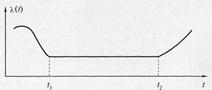 Рис.1.5. Зависимость безотказной работы элемента от времени работы Интенсивность отказов λ(t), или λ -характеристика, очень часто используется для количественной оценки надежности элементов и при расчете надежности системы автоматики, состоящей из нескольких элементов. Величину λ можно оценить как отношение числа отказавших элементов к числу оставшихся к данному моменту времени работоспособными элементов, взятое за единицу времени. Обычно единицей измерения интенсивности отказов является число отказов в час. Типичная кривая интенсивности отказов в зависимости от времени эксплуатации для большого числа однотипных элементов, изготовленных на одном и том же заводе по одинаковой технологии, приведена на рис.1.6.