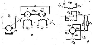 Рис.2.18. Схемы электромашинных усилителей Простейшим электромашинным усилителем является генератор постоянного тока Г, вращаемый с постоянной скоростью с помощью вспомогательного двигателя Д1 (рис.2.18, а). Выходное напряжение U вых генератора пропорционально потоку возбуждения. Подавая входное напряжение UBX на обмотку возбуждения, можно управлять выходным напряжением генератора, меняя его величину и знак. Коэффициент усиления определяется отношением выходной мощности генератора к мощности, рассеиваемой на обмотке возбуждения, и может равняться 20-100. Нагрузкой генератора, как уже указывалось, обычно является цепь якоря исполнительного двигателя Д2. Зависимость выходного напряжения генератора от управляющего напряжения линейна в начальной части характеристики, которая достигает насыщения при большом значении управляющего тока. Вследствие гистерезиса магнитной цепи характеристика имеет вид узкой петли. Наряду с простыми электромашинными усилителями применяются также более совершенные усилители с поперечным полем (рис.2.18, б). Якорь такого усилителя содержит две пары щеток, расположенных перпендикулярно одна к другой, вместо одной пары щеток в обычных усилителях. На статоре располагаются одна или несколько управляющих обмоток WУ, компенсационная обмотка WK, обмотка подмагничивания WП и обмотка добавочных полюсов. Если подать на обмотку управления ток Iу, создаваемый напряжением UBX, то по продольной оси усилителя образуется поток Фу. В поперечной цепи якоря под действием этого потока наводится э. д. с. поперечной цепи Е1. Поперечная пара щеток Щ1 и Щ2 замкнута на малое сопротивление обмотки подмагничивания, поэтому даже небольшая э.д.с. Е1 вызывает в поперечной цепи значительный по величине ток I1. Этот ток, протекая по якорю, создает поперечный магнитный поток Ф1, благодаря которому в продольной цепи якоря наводится э. д. с. Е2, снимаемая со щеток продольной цепи Щ3 и Щ4 на нагрузку RH. Эффект усиления связан с тем, что поперечный поток Ф1 оказывается значительно большим, чем вызвавший его исходный продольный поток Фу. Когда к щеткам продольной цепи подключена нагрузка, то по проводникам якоря проходит ток нагрузки Iн. Напряжение Uвых отличается от э. д. с. E2 на величину IнRi т. е. Uвых = Е2-IHRi, где Ri - внутреннее сопротивление ЭМУ. Поток реакции якоря Ф2, создаваемый нагрузочным током, действует навстречу потоку управления Фу, компенсируя его действие. Поэтому во всех ЭМУ с поперечным полем, помимо управляющей обмотки, предусмотрена так называемая компенсационная обмотка Wк, которая выполняется из толстого провода и включается в цепь нагрузки таким образом, чтобы ее поток ФК мог скомпенсировать действие потока Ф2. Направление потока Фк совпадает с направлением потока Фу. На холостом ходу (IН = 0) E2 и Uвых прямо пропорциональны управляющему току Iу, а следовательно, и входному напряжению UBX, так что Uвых = kЭUBX, где kЭ - коэффициент усиления ЭМУ. При наличии нагрузочного тока Е2 может увеличиваться или уменьшаться по сравнению с э. д. с. холостого хода в зависимости от соотношения между потоками Ф2 и Фк. При |Фк|=|Ф2] усилитель полностью скомпенсирован и его э.д.с. не зависит от тока нагрузки. При |ФК|<|Ф2| увеличение нагрузочного тока вызывает уменьшение э.д.с. При |Фк|>|Ф2| увеличение нагрузочного тока сопровождается увеличением э.д.с. В последнем случае 