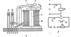 Реле. Реле является простым автоматическим устройством, приводящим в действие одну или несколько управляемых цепей при достижении параметров управляющей цепи определенного значения. Вопросы автоматического управления, регулирования, защиты, блокировки решаются с помощью различного рода реле. Любое реле состоит из трех основных частей: измерительной, промежуточной и исполнительной. Поэтому большинство реле может быть получено из рассмотренных выше датчиков путем присоединения к ним исполнительной части. В системах автоматики наибольшее распространение получили электромеханические реле электромагнитные, электродинамические, магнитоэлектрические и др.), в которых изменение входной электрической величины вызывает механическое перемещение якоря, приводящее к замыканию или размыканию электрических контактов. В последнее время широко применяют также электронные реле как контактные, так и бесконтактные. Различают электромагнитные реле постоянного и переменного тока. В свою очередь реле постоянного тока подразделяются на нейтральные и поляризованные. Нейтральное реле одинаково реагирует на постоянный ток обоих направлений, протекающий по его обмотке. Действие поляризованного реле зависит от направления, тока. Устройство и схема включения электромагнитного реле приведены на рис.2.21, а, б. Реле представляет собой электромагнит с обмоткой W, по которой проходит ток I1. При определенной величине тока срабатывания Iср к сердечнику С электромагнита притягивается якорь Я. При этом контакты К1 другой электрической цепи замыкаются рычагом Р и по нагрузке RH проходит ток 12. Контакты К2, наоборот, размыкаются, обесточивая свою цепь.