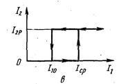Рис.2.21. Устройство и схема включения электромагнитного реле: а - устройство; б - схема включения; в - характеристика Реле является усилителем мощности: в первичной цепи обмотки W при прохождении тока I1 расходуется мощность Р1 а во вторичной цепи контактов при прохождении тока - мощность Р2, значительно большая, чем P1 Таким образом, с помощью источника малой мощности Р1 можно управлять подачей на сопротивление нагрузки RН значительно большей мощности Р2. Характеристика реле показана на рис.2.21, б. Время срабатывания маломощных реле составляет 10÷20 мс, а мощных 100÷200 мс. В замкнутом положении магнитный поток Ф и, следовательно, сила притяжения якоря к сердечнику больше, чем в разомкнутом. Этим объясняется то, что опускание реле происходит при значении тока I10 меньшем, чем I ср (рис.2.21, в). Величина I10 называется током отпускания реле. Таким образом, статическая характеристика реле является неоднозначной нелинейной зависимостью. Отношение тока отпускания к току срабатывания называется коэффициентом возврата реле: