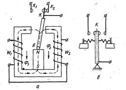 Вместо двух пар контактов в реле может быть применена контактная группа, состоящая из нескольких пар замыкающих или размыкающих контактов. На рис.2.22, а изображена схема поляризованного реле постоянного тока. Поток, создаваемый обмоткой W1 при определенном направлении тока I 1 совпадает с потоком Ф1 и увеличивает его; при этом поток, создаваемый обмоткой W2 направлен навстречу потоку Ф2 и ослабляет его. В этом случае сила притяжения якоря к левому полюсу сердечника больше, чем сила притяжения к правому; якорь, притягиваясь влево, замыкает контакты К и K1. Если ток меняет свое направление, то поток Ф2 становится больше, чем Ф1 и замыкаются контакты К и К2. Имеются трехпозиционные поляризованные реле, в которых при I1= 0 контакт К находится в среднем, нейтральном, положении (рис.2.22, б). Поляризованные реле обладают высокой чувствительностью и быстродействием. Мощность срабатывания у этих реле равна 10-4÷10-5 Вт. Время срабатывания составляет 1÷5 мс.
